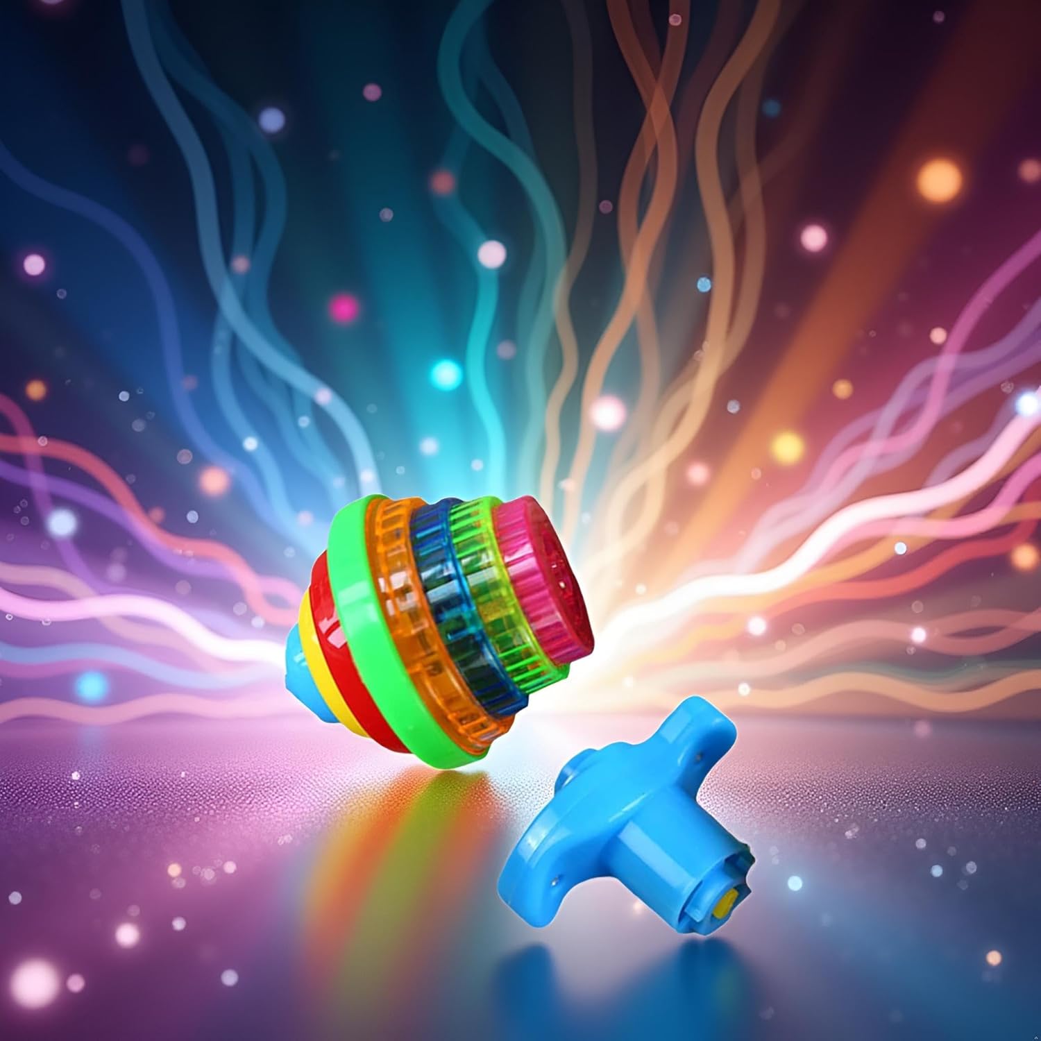 This single-piece colorful spinning top toy with launcher is a fun and engaging activity for young children. Made with vibrant, transparent plastic in layered colors, the top creates a dynamic spinning effect when launched—flashing bright lights and, in some versions, playing cheerful music during its spin.